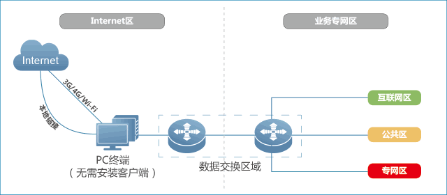当前,业务专网中存在一个普遍的安全问题——“一机两用”。业务专网用户在接入业务专网时,需要断开互联网的连接,包括3G/4G/Wi-Fi等,而现实是,用户在访问业务专网时,互联网也可以访问,那么此时用户使用的这台PC很容易成为网络攻击的跳板机,进而威胁到业务网的安全。