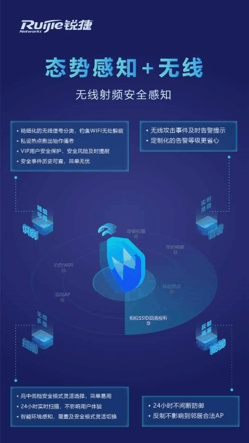 尊龙时凯安全态势感知与无线联动,实现对钓鱼Wi-Fi以及流氓AP等深度扫描、识别、告警、防御,让无线摆脱无安全监管的窘境。