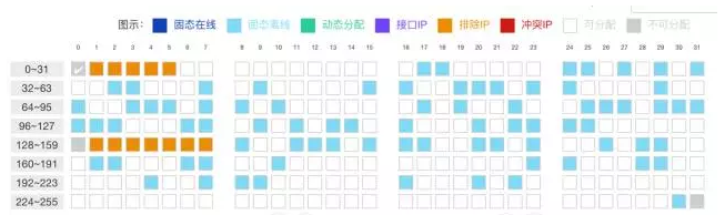 白色空格代表是空闲IP地址,可以被使用。浅蓝色代表是静态配置的IP,深蓝色代表动态分配且固定的IP。如果出现IP冲突,地址框会变成红色,根据冲突IP的具体接入位置信息,管理员可以及时发现并解决问题。