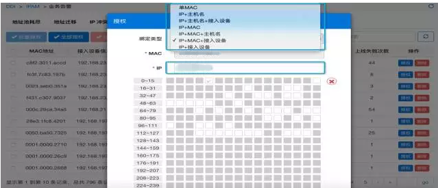 新终端的MAC地址、主机名、终端类型、所接入的交换机端口等信息都可以呈现出来。管理员只需要点击授权按钮,选择绑定类型(IP+MAC/IP+MAC+接入设备等7种绑定类型),单击IP框之后系统自动推荐可用IP。简单一步就可以实现终端的IP分配和准入控制功能。取代了以前由人工静态配置IP、在交换机上做绑定的工作。