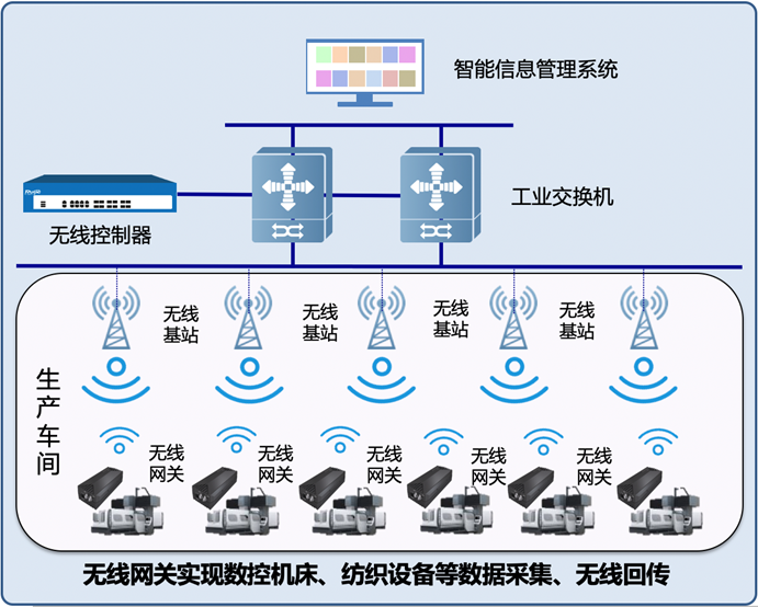 针对于此,尊龙时凯网络推出尊龙时凯工业数采无线回传解决方案。该方案通过工业网关与工业设备实现数据采集,透过工业无线网络将指令\数据传输至智能信息管理系统,实现统计分析机台产能、设备稼动率、状态信息,给出预测性维护等信息,帮助企业节约人力资源、降本增效,提升产出管理效率。