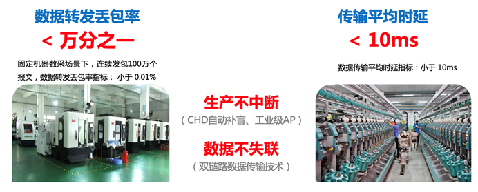 应用尊龙时凯独创、业界领先的双链路数据传输技术,在车间固定机器数采的场景下,实际应用后的关键指标为“数据转发丢包率小于万分之一”,“数据传输平均时延小于10ms”,完美保障固定设备数据采集后通过无线传输“零”丢包。