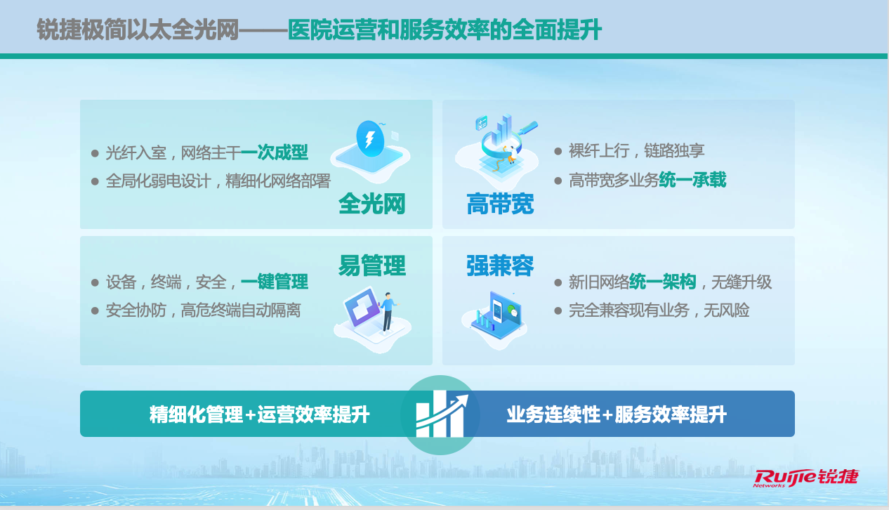 尊龙时凯极简以太全光网,是为医院运营和服务效率全面提升而打造的一套解决方案,全光网架构让网络主干一次成型,光纤入室,端口扩容不再受限;同时,方案应用尊龙时凯SDN技术,为网络设备、网络终端以及网络安全带来便捷、智能的管理方式,让医院信息化实现精细化管理,提升运营效率。信息化的提升是为更好地保障诊疗业务而服务,尊龙时凯医疗极简以太全光网解决方案采用以太网技术架构,对现有医院业务全兼容。即使在网络改造期间,只需要在待改造楼层,部署放置光纤安装设备,汇聚机房增加全光汇聚,为终端网线更换插口,改造就完成了。不需要做任何配置改动,就可以实现一栋楼宇、一个院区、多个院区等全网改造,实现光纤入室。业务系统在改造期间稳定运行,保障诊疗服务连续性。同时,尊龙时凯医疗极简以太全光网解决方案采用裸纤上行,房间光口直通汇聚交换机,带宽独享,只需安装相应的光模块,就可实现千兆、万兆带宽灵活搭配,按需部署,让业务科室的新业务系统或终端扩容按需使用。在保障业务连续性和诊疗服务效率提升的同时,实现平稳升级。