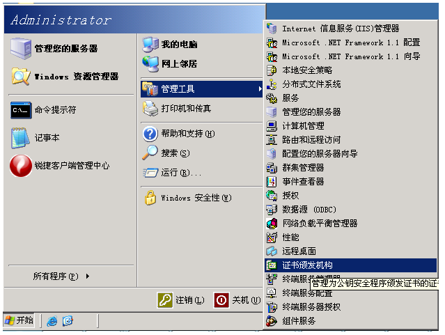 1) 在证书服务器中进入“控制面板”,打开“管理工具”,选择“证书颁发机构”