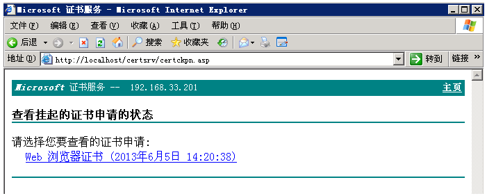 2) 选择“查看挂起的证书申请状态”,找到自己申请的证书