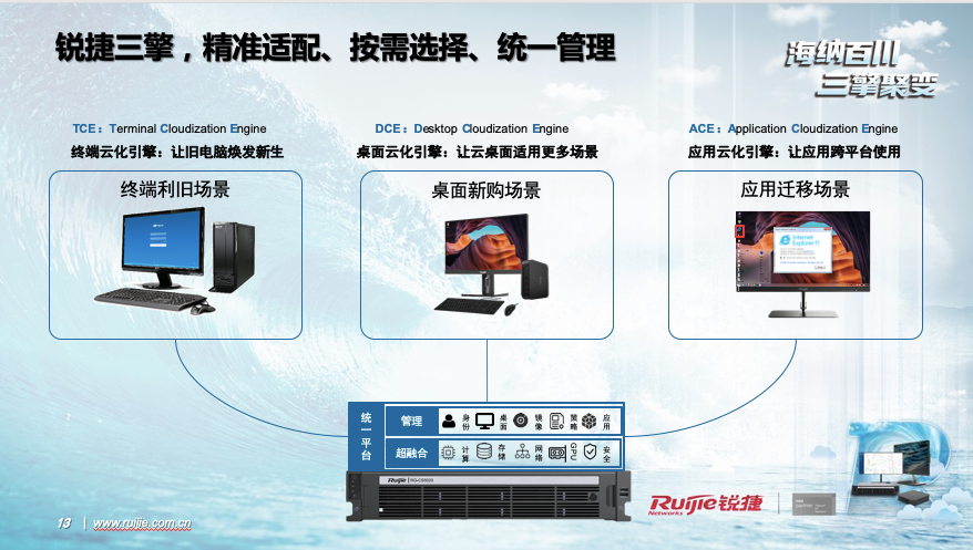 1、终端云化引擎(TCE)可将各类型终端、PC云化成为云终端,统一纳管、简化运维、提升安全。