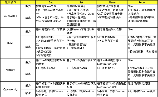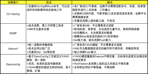 针对于上述的四种日常操作,无论是基于传统的CLI + Syslog、SNMP,还是基于比较流行的Netconf、OpenConfig,目前看都只能满足部分需求。同时,在性能、兼容性、扩展性、标准化等方面遇到瓶颈,只能同时采用多种运维接口组合来满足自动化运维平台的快速、持续集成。这几种运维接口简单分析如下: