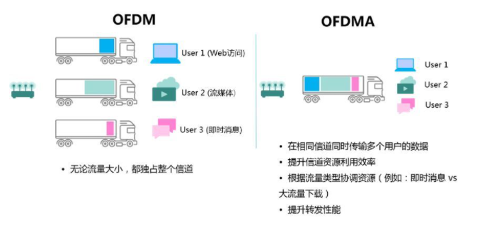 正交频分多址技术(OFDMA,Orthogonal Frequency Divi-sion Multiple Access)将带宽划分成正交互不重叠的子载波集,再由这些子载波集构成传输的最小子信道,称为“资源单元(RU)”,每个RU最少包含26个子载波。OFDMA根据用户需求,针对不同的流量扩展资源(如即时消息和流媒体),分配不同大小的RU,最大程度地优化了系统资源。与传统的OFDM相比,OFDMA就相当于一辆卡车装了多个型号的货箱,装满后一起送给用户;而OFDM则相当于一辆卡车,只装一个型号的货箱,没装满也会发车,如果需要多种货物则需要多辆卡车,浪费了很多带宽资源。