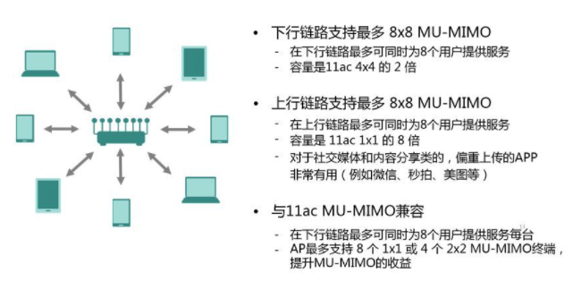 OFDMA技术允许同一信道发送不同类型的流量,提高了信道利用率,1024-QAM则提高了星座图每个点的可携带数据量,二者从提高数据吞吐量的角度提高了数据传输速率;MU-MIMO技术提高了可同时连接STA数量,避免了传统网络排队传输的情况,有效利用了闲置带宽,从网络整体上提高了数据传输速率。