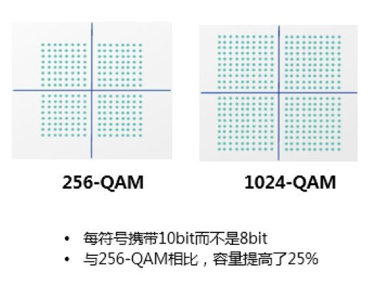 正交振幅调制(QAM,Quadrature Amplitude Modulation)是一种将两种条幅信号汇合到一个信道的方法,利用星座图来对数据进行调制解调。Wi-Fi6优化了原有的调制编码策略,将Wi-Fi5的256-QAM优化成1024-QAM,使星座图中原来一个点可以携带的数据量从8个bit提高到10个bit。
