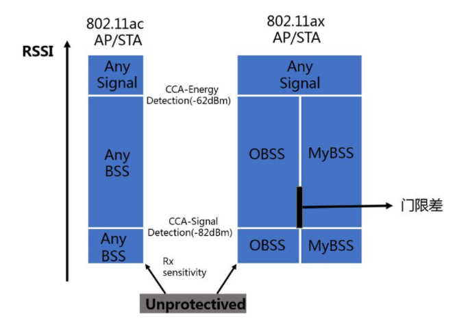 基于基本服务集的着色技术(BSS-color)通过STA识别基本服务集(BSS)的信号,来为不同的AP-STA组合标记不同的颜色。当STA使用基于颜色代码的CCA门限规则时,将自己的发射功率等数据与AP交换,AP通过接收到的数据反馈适合当前网络的最优参数,最大程度地减少网络空间的同频干扰。结合空间复用技术,传统网络中固定区域中只能一个BSS网络传输的情况将变成固定区域同颜色的BSS网络可以同时传输。