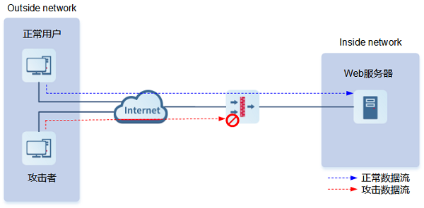 为有效识别正常数据流和攻击数据流,数据流经过安全防护产品时一般会经过攻击检测和攻击防范是两个至关重要的阶段。通过分析经过设备的报文的内容和行为,判断报文是否具有攻击特征,并根据配置对具有攻击特征的报文执行相应的防御措施。安全防护设备中常用的攻击检查和攻击防范特性包括: